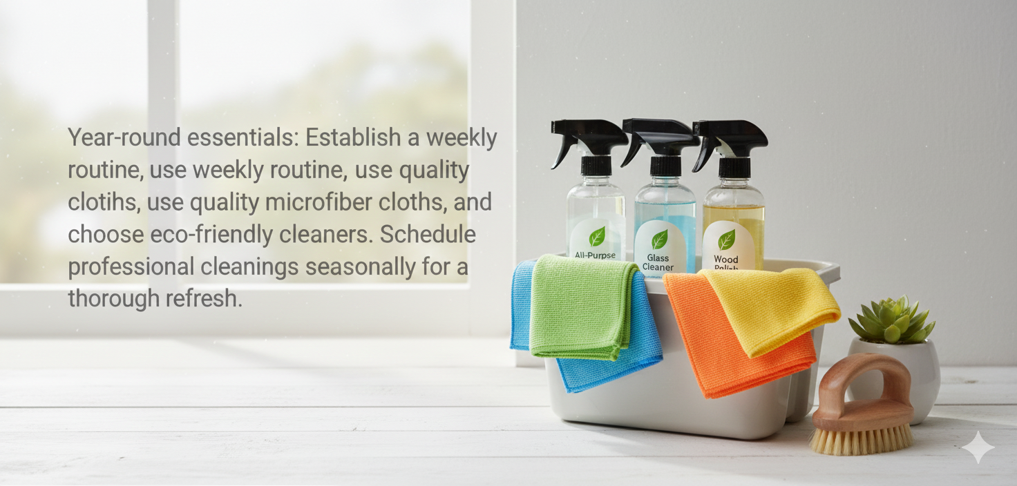 Year-round essentials: Establish a consistent weekly routine, use high-quality microfiber cloths for better dust and dirt removal, and choose eco-friendly, non-toxic cleaners whenever possible. Schedule professional cleanings seasonally to ensure a deeper, more thorough refresh.